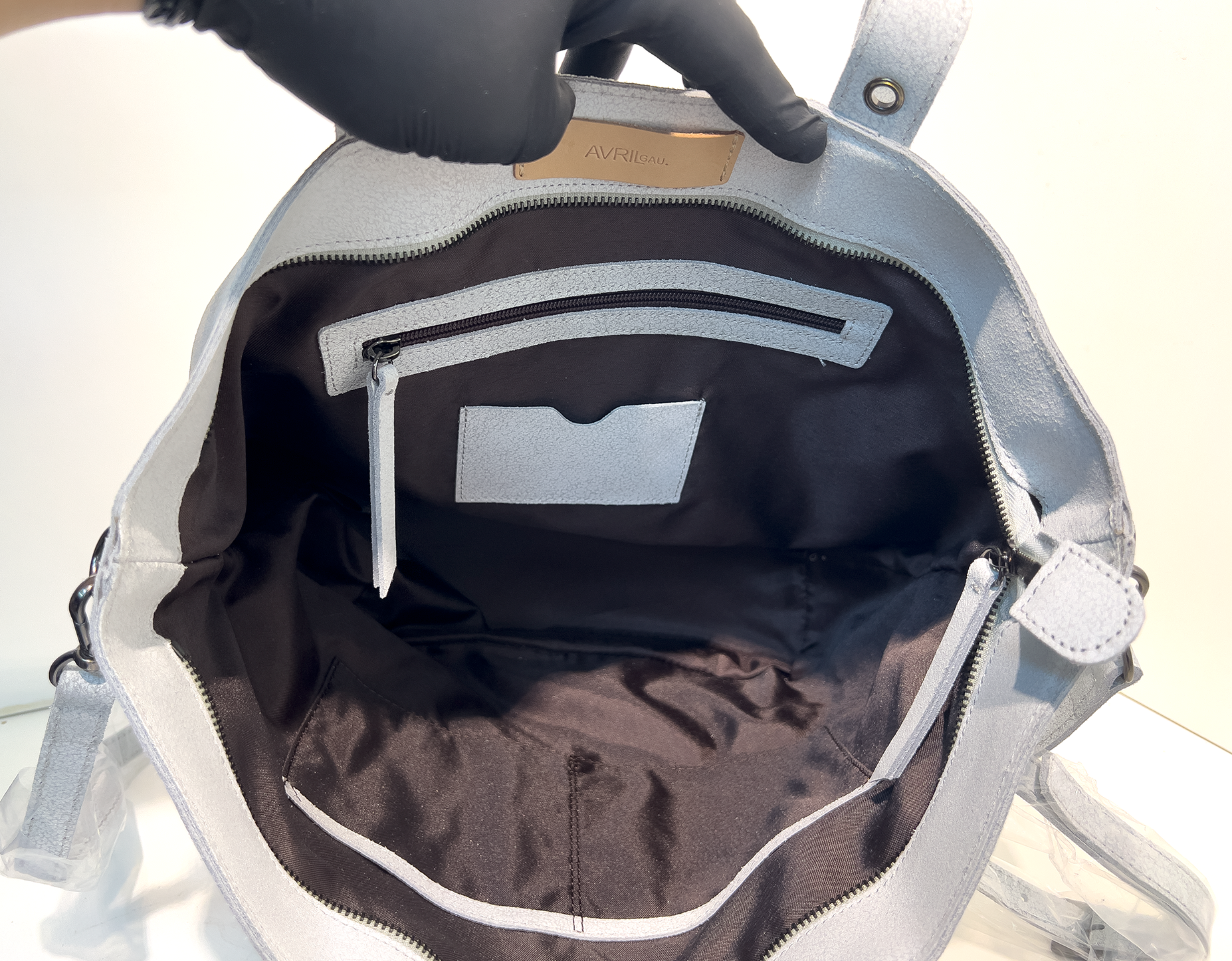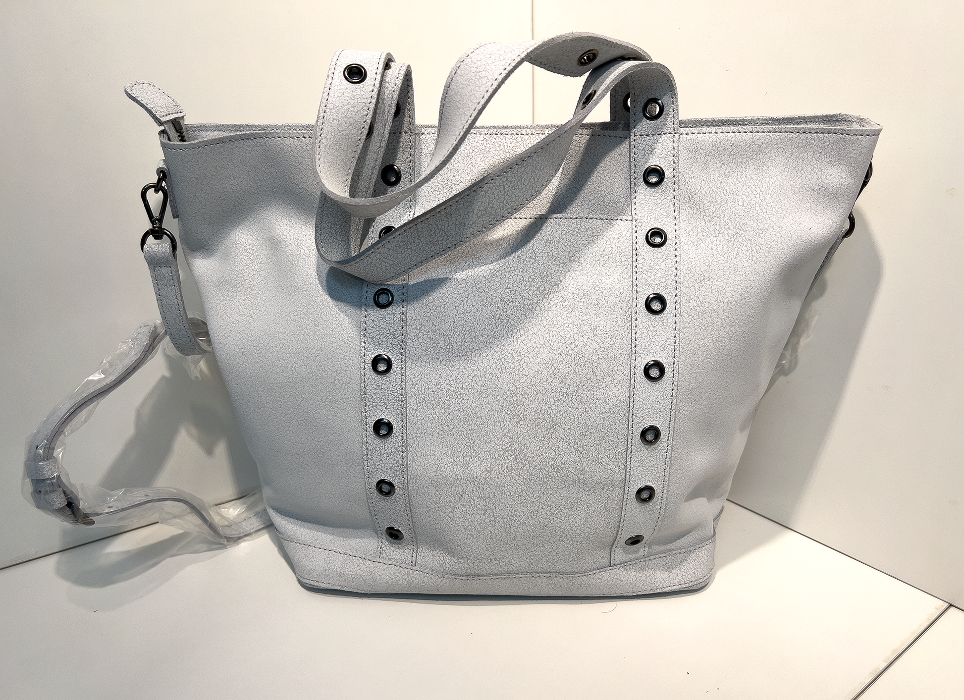 이 가방은 은은한 화이트톤 합성가죽을 베이스로, 세로로 배치된 블랙 아일렛 장식이 포인트인 토트&숄더 겸용 백입니다. 넓고 견고한 바닥과 여유로운 수납 공간, 그리고 내부 지퍼 포켓과 오픈 포켓이 있어 소지품을 효율적으로 정리할 수 있습니다. 기본 스트랩 외에도 넓은 패브릭 스트랩이 함께 제공되어, 다양한 분위기로 연출이 가능합니다. 심플함 속에 디테일로 멋을 더한 실용적인 아이템입니다.