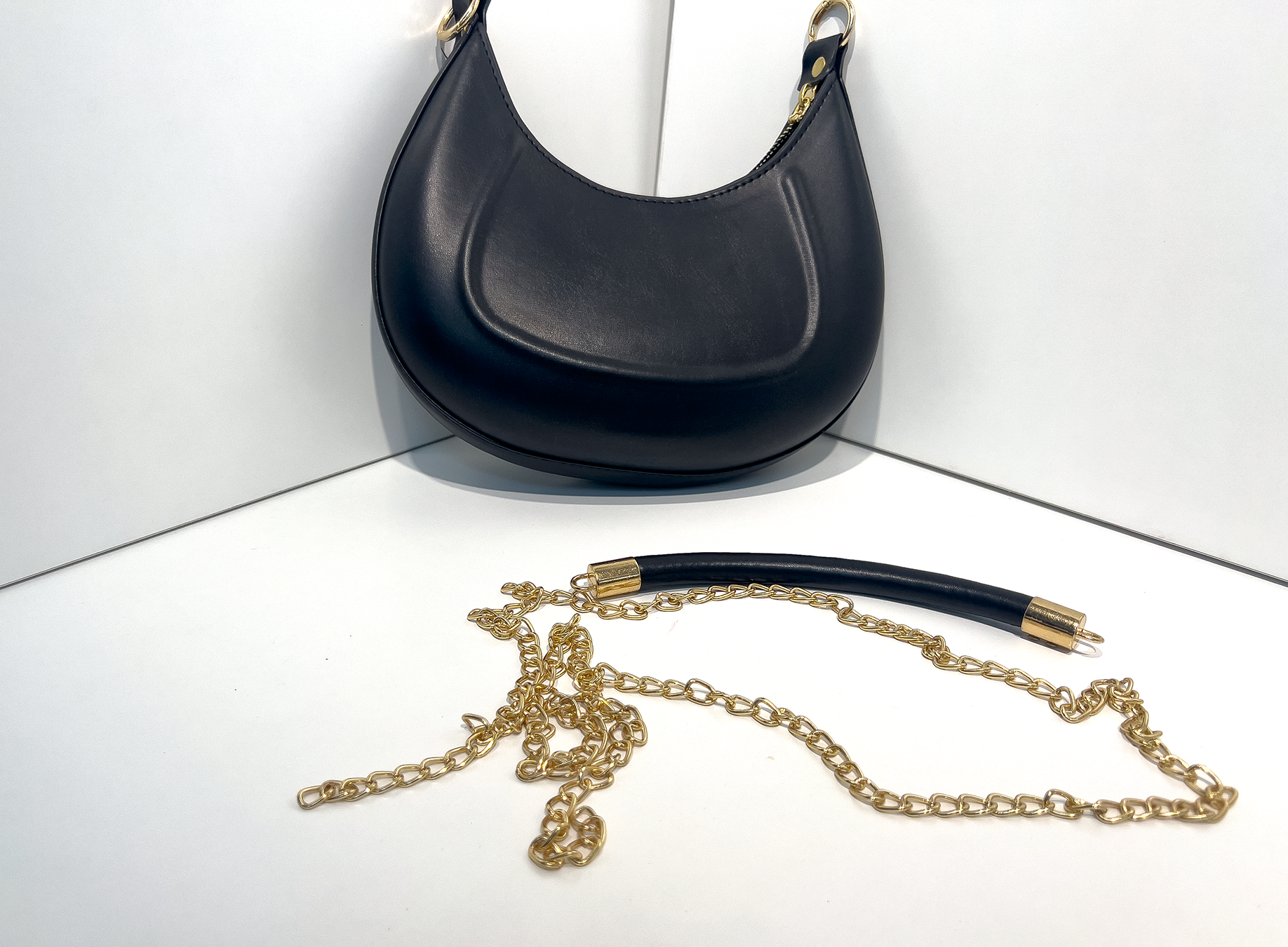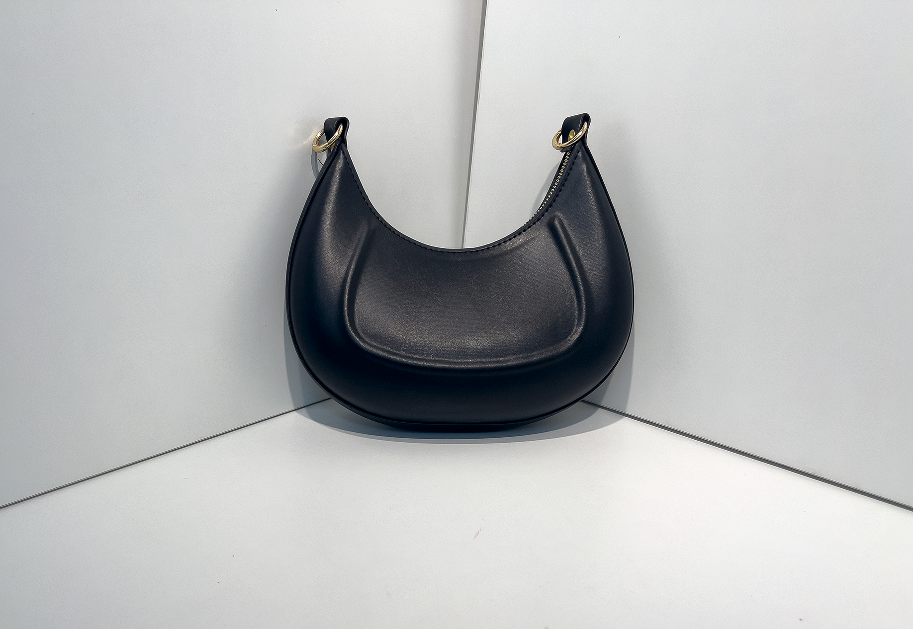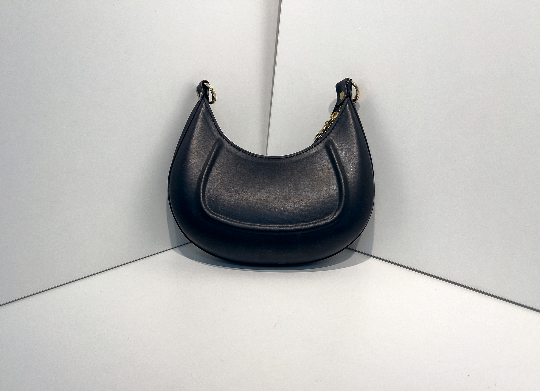 이 가방은 고급스러운 블랙 컬러가 돋보이는 반달 쉐입 숄더백입니다.