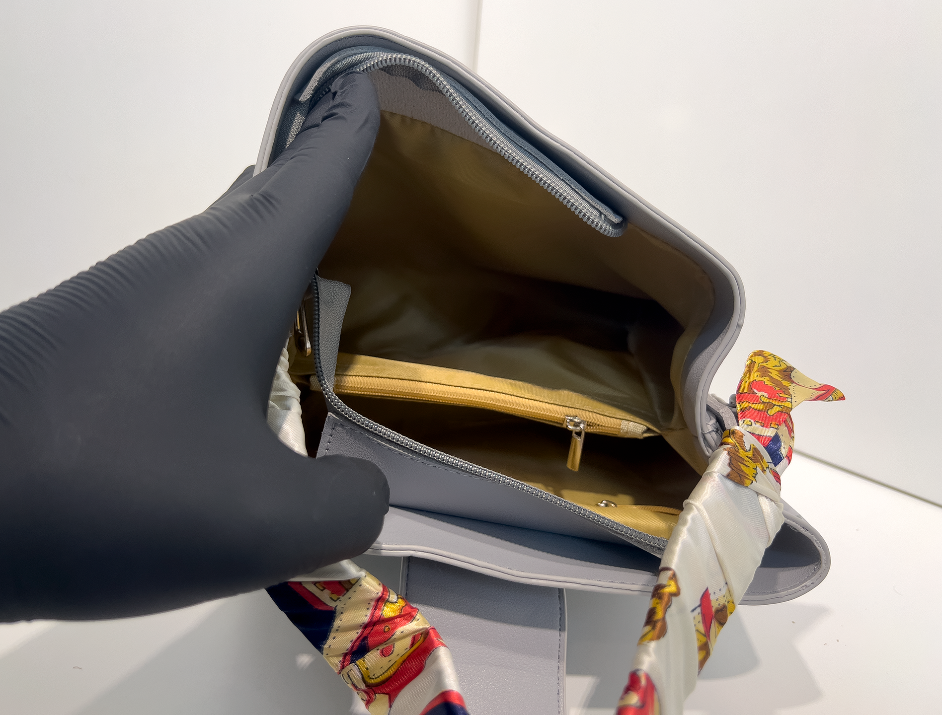 부드러운 합성가죽 소재로 제작되어 고급스러움을 더했으며, 손잡이에는 컬러풀한 패턴 스카프 장식이 더해져 포인트가 됩니다. 내부는 지퍼 포켓과 오픈 포켓으로 나누어져 있어 소지품을 깔끔하게 정리할 수 있으며, 탈부착 가능한 롱 스트랩이 포함되어 손에 들거나 어깨에 멜 수 있어 활용도가 높습니다.