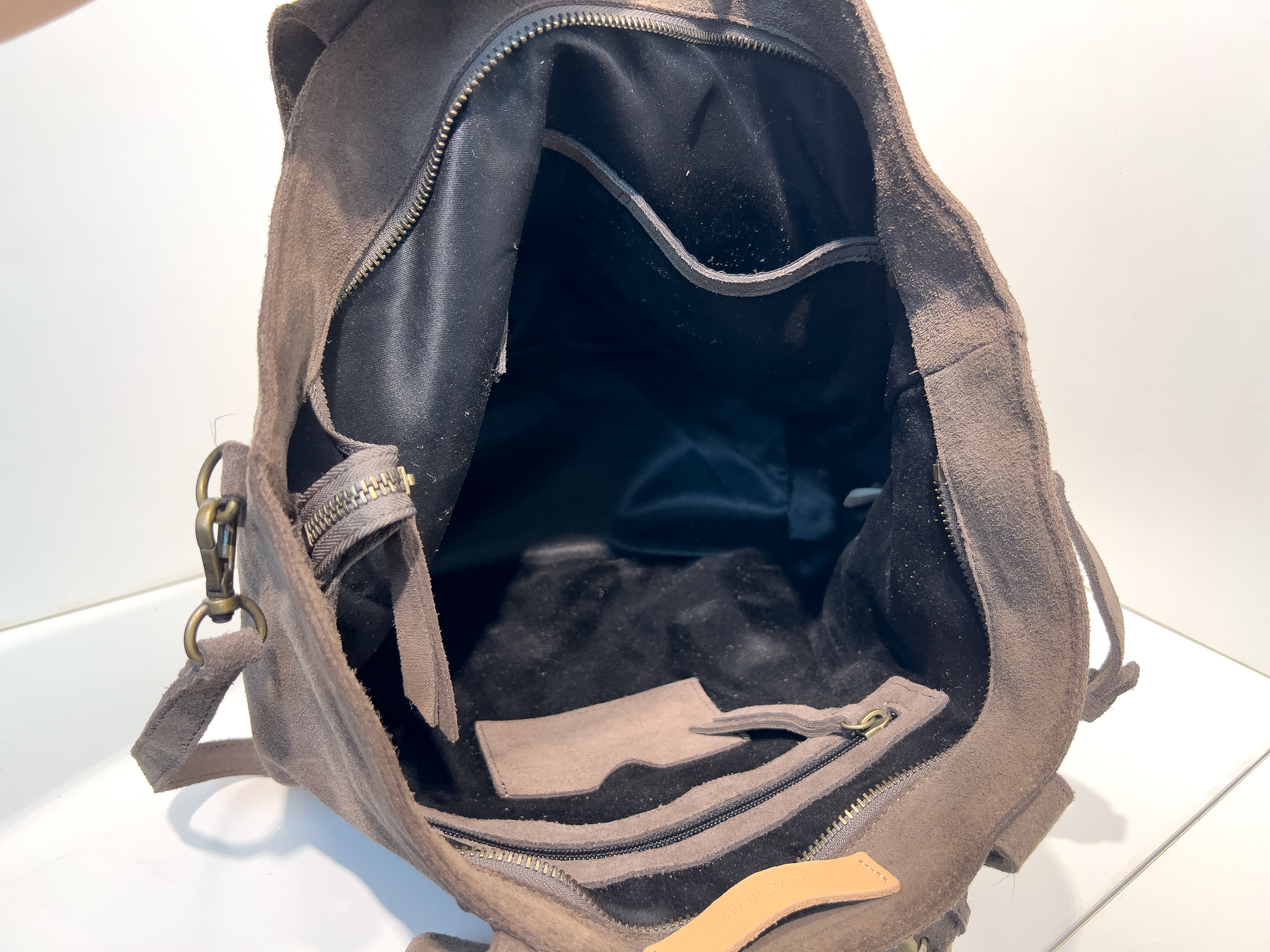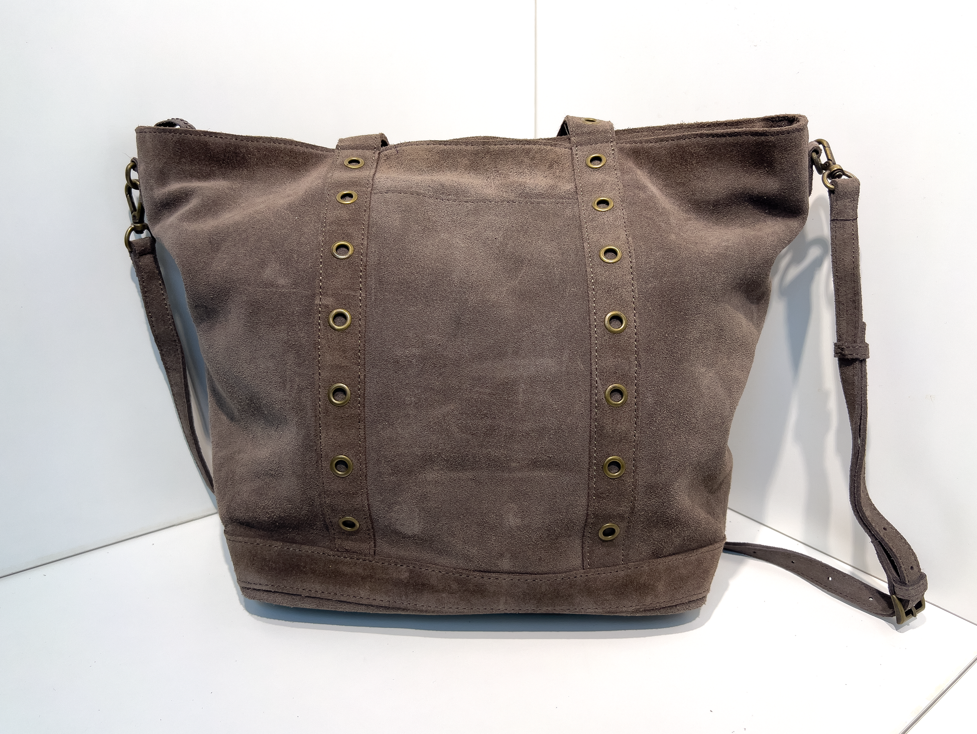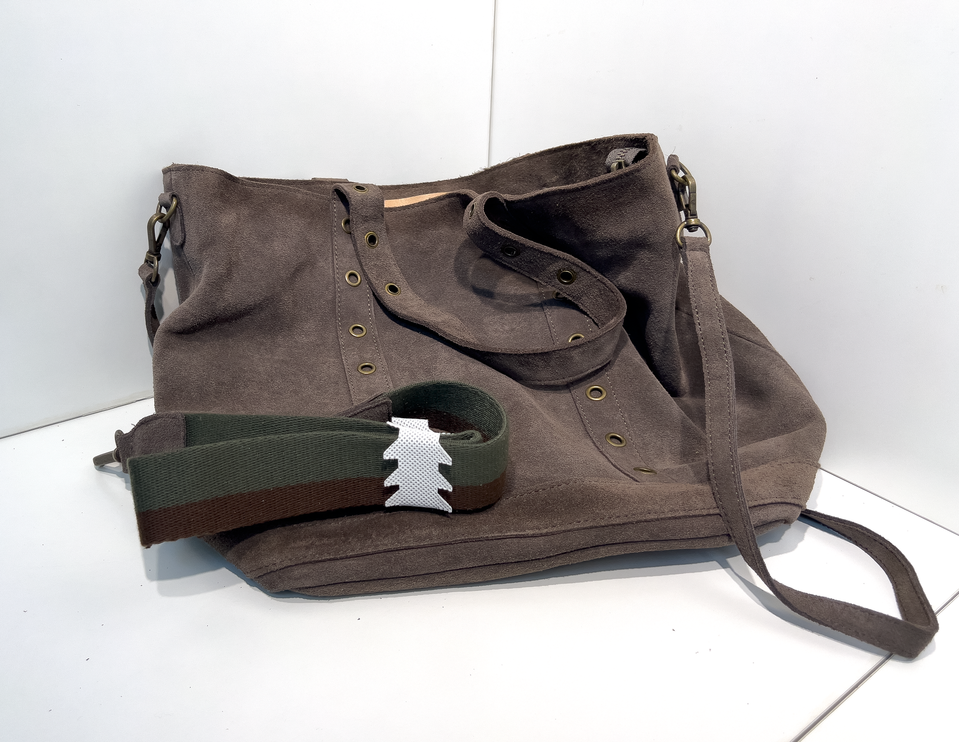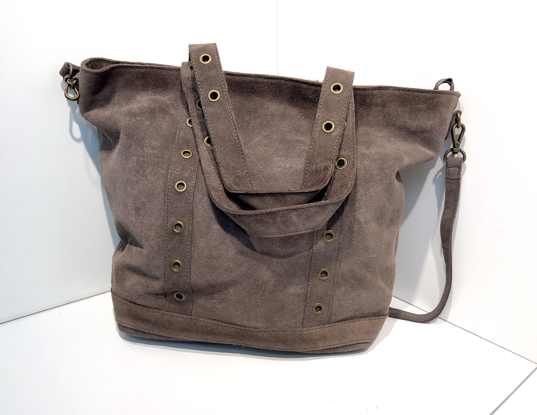 이 가방은 따뜻하고 부드러운 촉감의 브라운 스웨이드 소재를 사용해, 내추럴하면서도 세련된 분위기를 연출합니다. 세로로 배열된 브론즈 컬러 아일렛 장식이 빈티지한 멋을 더하며, 넓은 내부 공간과 다양한 포켓 구성으로 실용성을 높였습니다. 기본 스트랩 외에도 와이드 패브릭 스트랩이 포함되어 있어, 캐주얼한 느낌과 포멀한 분위기를 모두 소화할 수 있는 다재다능한 아이템입니다.